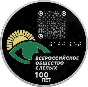 На оборотной стороне монеты расположены цветной рельефный логотип Всероссийского общества слепых; рельефная надпись «100 лет», выполненная шрифтом Брайля; внизу — рельефная надпись в две строки «100 ЛЕТ». Над логотипом ВОС размещен выполненный в технике лазерного матирования QR-код. При наведении камеры смартфона открывается официальный сайт ВОС, на котором можно получить информацию о монете с помощью тифлокомментирования.