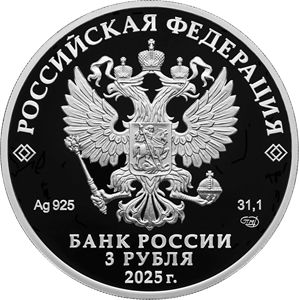 На лицевой стороне монеты расположено рельефное изображение Государственного герба Российской Федерации, имеются надписи «РОССИЙСКАЯ ФЕДЕРАЦИЯ», «БАНК РОССИИ», номинал монеты «3 РУБЛЯ», дата «2025 г.», обозначение металла по Периодической системе элементов Д.И. Менделеева, проба сплава, товарный знак Санкт-Петербургского монетного двора и масса драгоценного металла в чистоте.